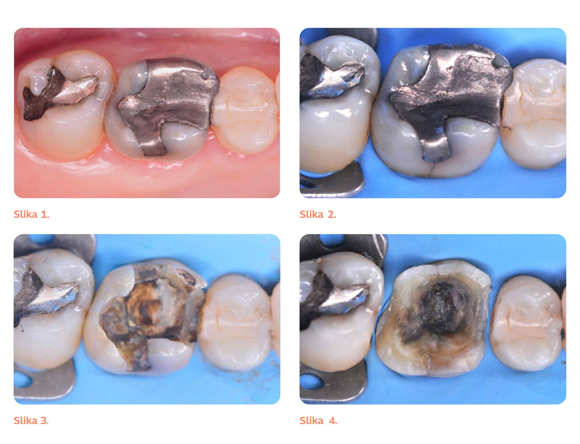Slika 1. Inicijalna klinička situacija. Kod pacijenta se uočavaju neadekvatni ispuni u gornjem desnom kvadrantu koji zahtevaju zamenu adekvatnim restaurativnim tretmanima. Konkretno, uočavaju se stari amalgamski ispuni na gornjim desnim molarima kao i preekstendirani, neestetski kompozitni ispun na gornjem drugom desnom premolaru.