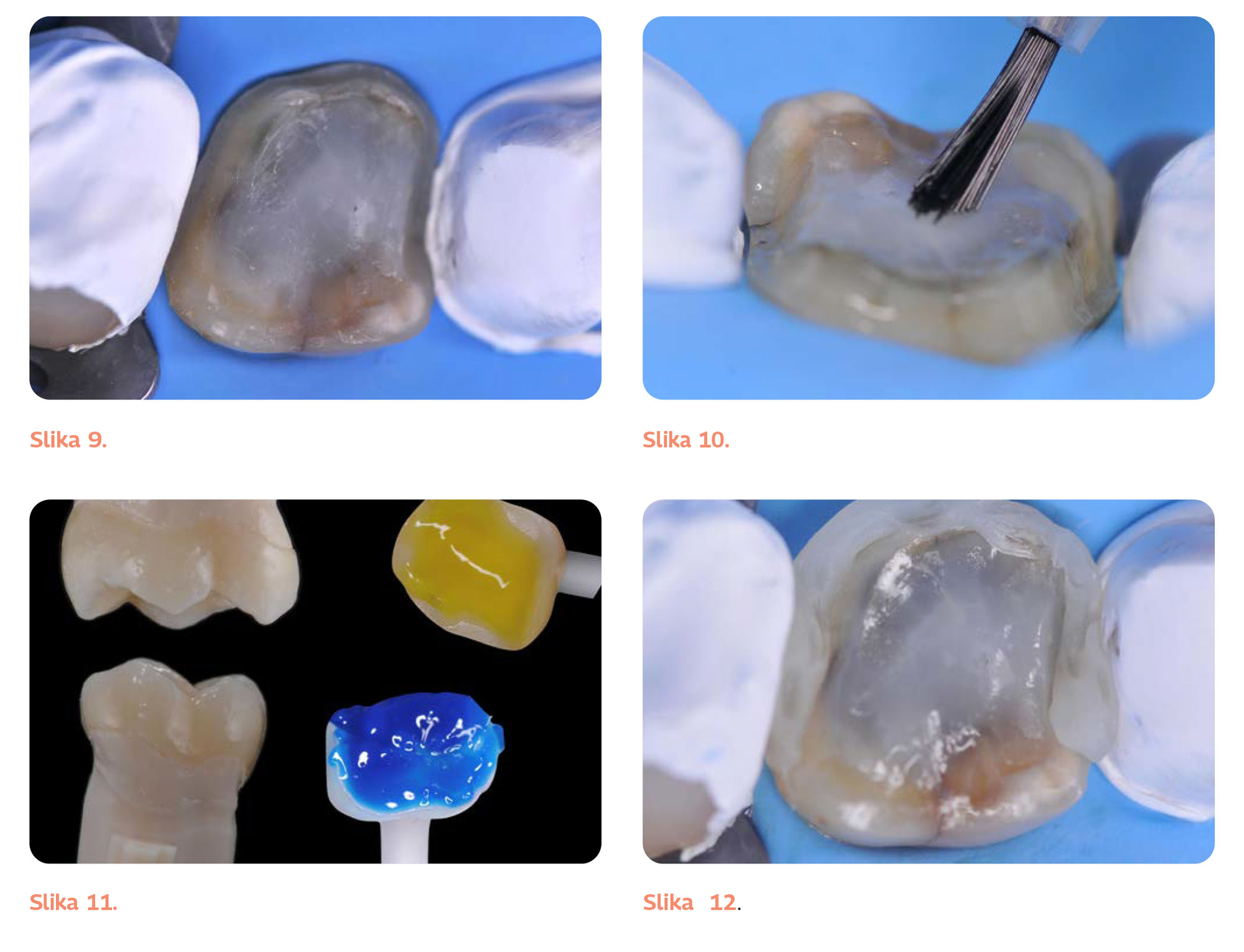 Slika 10. OptiBond Universal (Kerr) je aplikovan i utapkavan u trajanju od 20 sekundi, nakon čega je sledilo sušenje vazduhom u istom trajanju kako bi se formirao tanak i ujednačen sloj. Adheziv je potom fotopolimerizovan u trajanju od 40 sekundi, čime je obezbeđena optimalna adhezivna efikasnost.