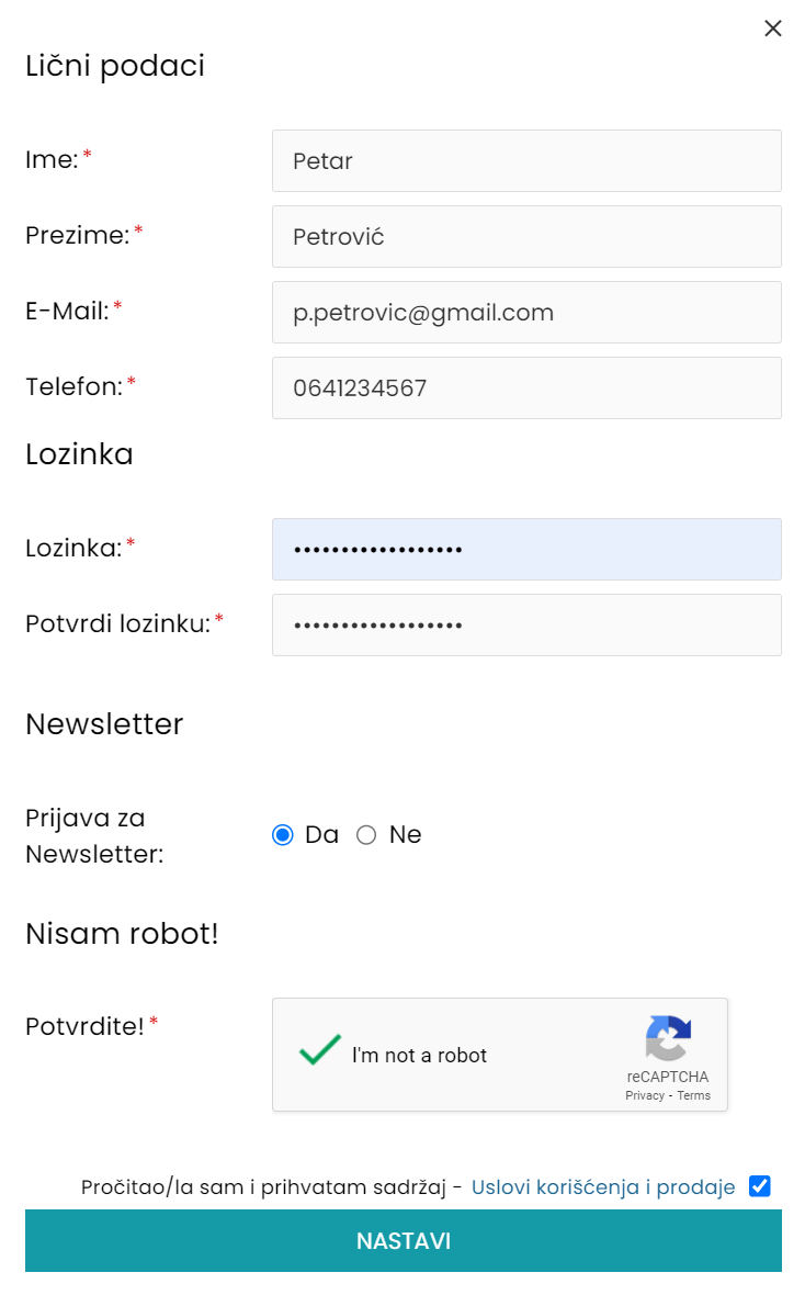 U prozoru za unos informacija o kupcu, unesite svoje podatke. Minimalan broj karaktera za lozinku je četiri. Savetujemo vam da za kreiranje što sigurnije lozinke koristite kombinaciju velikih, malih slova, znakova i brojeva. Kako biste bili u toku sa svim aktuelnim dešavanjima i popustima, pozivamo vas da se prijavite na naš newsletter. Kada završite sa unosom podataka, nakon potvrde da "Niste robot" i naše "Politike privatnosti", klikom na dugme "NASTAVI" proces registracije je završen. Nakon toga će vam sistem na E-Mail adresu koju ste uneli, poslati E-Mail dobrodošlice sa linkom za prijavu.